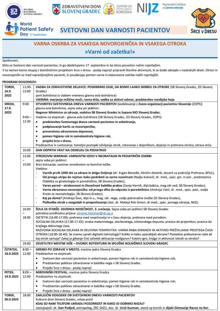 V ta namen bomo skupaj z bolnišničnim projektom Srce v dresu - podaj naprej! pripravili številne aktivnosti, ki se bodo odvijale v naslednjih dneh. Otroci in novorojenčki so med najranljivejšimi pacienti, ki poudarjajo pomen varne in kakovostne oskrbe naših najmlajših.
